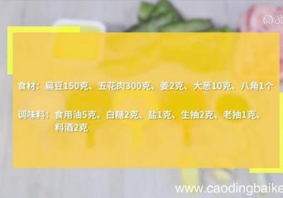 步骤1食材:扁豆150克、五花肉300克、姜2克、大葱10克、八角1个调味料:食用油5克、白糖2克、盐1克、生抽2克、老抽1克、料酒2克步骤2扁豆去筋 。五花肉切厚块 。步骤3冷水入锅、水沸后、煮15分钟、捞出备用 。步骤4热锅倒油、放入五...