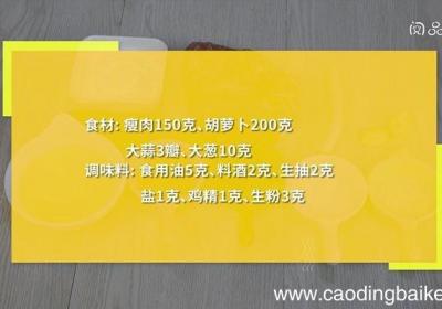 步骤1食材:瘦肉150克、胡萝卜200克、大蒜3瓣、大葱10克调味料:食用油5克、料酒2克、生抽2克、盐1克、鸡精1克、生粉3克步骤2瘦肉切片,加入料酒、生粉,拌匀,腌制10分钟 。步骤3胡萝卜切片 。步骤4大蒜切片 。步骤5大葱切片 。步...