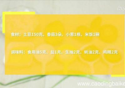 步骤1食材:土豆150克、香菇3朵、小葱1根、米饭1碗 。调味料:食用油5克、盐1克、生抽2克、蚝油2克、鸡精2克 。步骤2土豆去皮,切小丁 。步骤3香菇切丁 。步骤4小葱切葱花 。步骤5炒锅中油温5成热时,放入香菇炒软,加入土豆翻炒片刻,...