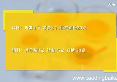 步骤1食材:鸡蛋一个,蛋黄一个,低筋面粉20克 。辅料:香草精3克,蜂蜜15克,白糖30克 。步骤2碗中倒入1个鸡蛋和3个蛋黄 。步骤3加入30克糖和15克蜂蜜打至浓稠 。步骤4筛入20克低筋面粉和3克香草精,翻拌均匀 。步骤5模具包上一层...