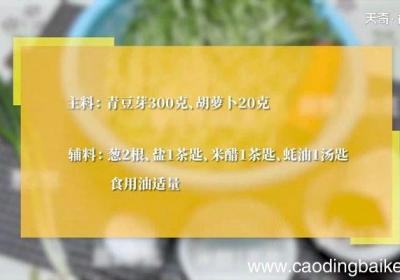 步骤1准备食材:青豆芽300克、蚝油1汤匙、盐1茶匙、米醋1茶匙、葱2根、胡萝卜20克、食用油适量 。【炒青豆芽的做法炒青豆芽怎么做】步骤2葱切段 。步骤3胡萝卜切丝 。步骤4起锅倒油,油热下入洗净的青豆芽翻炒,再加入蚝油、米醋、盐继续翻炒...