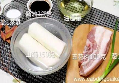 步骤1主料:五花肉100克、山药150克 。辅料:葱1根、酱油1汤匙、盐1茶匙、油适量 。步骤2山药切块 。步骤3五花肉切片 。步骤4葱切成葱花 。【五花肉炖山药怎么做 五花肉炖山药的做法】步骤5锅中倒入油,油热后加入五花肉,炒至颜色金黄,...