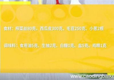 步骤1准备食材:榨菜丝80克、西瓜皮300克、毛豆250克、小葱2根、食用油5克、生抽2克、白糖1克、盐5克、鸡精1克步骤2西瓜皮去掉翠衣、红瓤,洗净待用,加4克盐,腌制30分钟,瓜皮出水变软,洗去盐分,挤干,切丝 。步骤3榨菜丝浸泡10分...