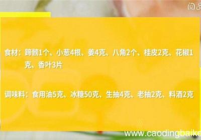 步骤1食材:蹄髈1个、小葱4根、姜4克、八角2个、桂皮2克、花椒1克、香叶3片 。调味料:食用油5克、冰糖50克、生抽4克、老抽2克、料酒2克 。步骤2姜切片 。步骤3小葱打葱结 。【冰糖蹄膀怎么做 冰糖蹄膀的做法】步骤4蹄髈洗净,冷水入锅...