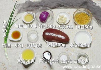 步骤1准备食材:猪腰300g、豌豆50g、洋葱40g、小葱30克、大蒜5瓣、水淀粉适量、香油50克、色拉油30克、盐3克、味精3克、白醋5克、绍酒一小勺、酱油1汤匙 。步骤2大蒜切片 。步骤3小葱切葱花 。步骤4洋葱切成小块 。步骤5猪腰除...