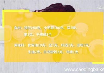 步骤1食材:猪肝250克,小毛葱(干葱)100克,蒜2瓣,姜3克,干辣椒3个 。调味料:食用油10克,盐1克,料酒2克,淀粉3克,生抽2克,白胡椒粉2克,鸡精1克 。步骤2猪肝切片,加盐、料酒、淀粉,拌匀,腌制20分钟 。步骤3姜切末,干辣...