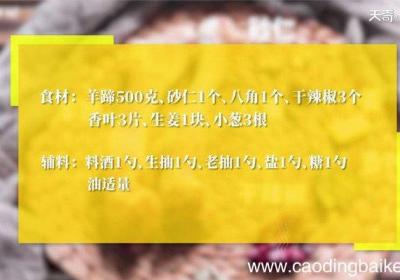步骤1所需食材:羊蹄2根,砂仁1个,八角1个,干辣椒3个,香叶3片,生姜1块,小葱3根、料酒1勺,生抽1勺,老抽1勺,盐1勺,糖1勺,油5克 。步骤2羊蹄切块,羊蹄冷水下锅煮开,加一勺料酒,煮5分钟捞出放冷水 。步骤3姜切片 。步骤4小葱切...