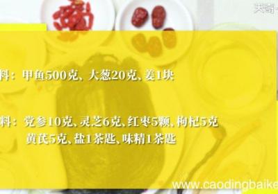 步骤1准备食材:甲鱼500克、党参10克、灵芝6克、红枣5颗、枸杞5克、黄芪5克、大葱20克、姜1块、盐1茶匙、味精1茶匙、油适量 。步骤2姜切片,大葱切段 。步骤3甲鱼剁去头,用热水烫刮去边和脚的黑皮,揭去盖、以冷水冲干净,再切块 。步骤...