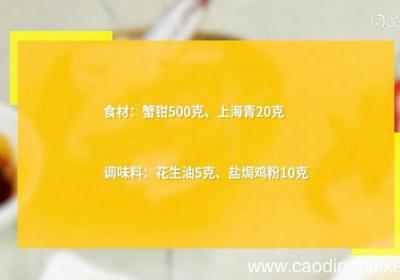 步骤1食材:蟹钳500克、上海青20克 。调味料:花生油5克、盐焗鸡粉10克 。步骤2上海青对半切开,放入沸水锅中焯烫40秒,捞出备用 。步骤3蟹钳洗净,加入盐焗鸡粉拌匀,腌制30分钟 。步骤4砂锅中铺一层锡纸,放入蟹钳,淋入花生油,盖上盖...