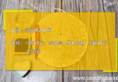 步骤1准备食材:绿豆芽200克、小葱20克、油适量、醋1茶匙、红椒10克、盐1茶匙 。步骤2绿豆芽洗净 。步骤3小葱切段 。【绿豆芽的做法 绿豆芽的做法】 步骤4红椒切片 。步骤5首先起锅烧油,油热放入红椒炒至断生,再倒入绿豆芽翻炒1分钟...