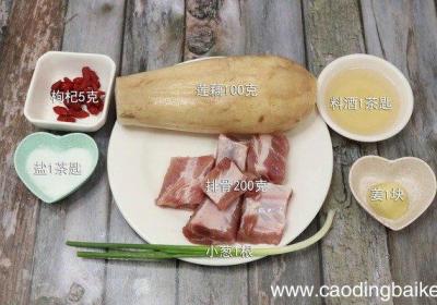 步骤1准备食材:排骨200克、莲藕100克、盐1茶匙、姜1块、料酒1茶匙、小葱1根、枸杞5克 。步骤2排骨洗净 。步骤3莲藕洗净去皮切块 。步骤4姜切片 。步骤5小葱切葱花 。步骤6首先起锅烧热水,水开将排骨、姜、料酒煮沸,捞出备用 。步骤...