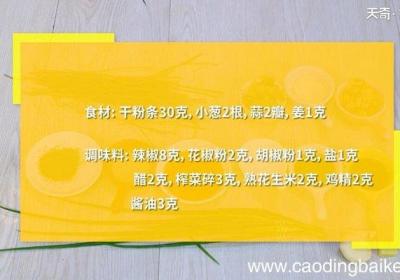 步骤1食材:干粉条30克,小葱2根,蒜2瓣,姜1克调味料:油辣椒8克,花椒粉2克,胡椒粉1克,盐1克,酱油3克,醋2克,榨菜碎3克,熟花生米2克,鸡精2克步骤2干粉条用温水泡发20分钟,捞出 。步骤3小葱切葱花 。步骤4蒜切末 。步骤5姜切...