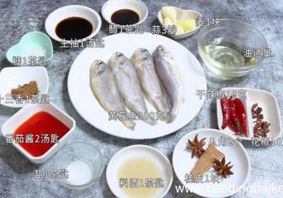 步骤1准备食材:黄花鱼300克,糖1茶匙,番茄酱2汤匙,蒜3瓣,姜1块,油适量,干辣椒10克,八角2个,桂皮1块,花椒10克,十三香1茶匙,盐1茶匙,料酒1茶匙,生抽1汤匙,醋1茶匙 。步骤2姜切丝 。步骤3干辣椒切段 。步骤4蒜切末 。步...