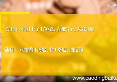 步骤1食材:水阳干子5片,青椒3个,大蒜3瓣 。调料:豆瓣酱1汤匙,盐1茶匙 。步骤2青椒去籽切丝 。步骤3【青椒炒水阳干子的做法 青椒炒水阳干子怎么做】水阳干子洗净切片 。步骤4蒜切片 。步骤5炒锅热油,爆香蒜片,下水阳干子翻炒3分钟 。...