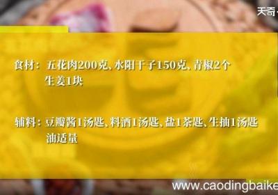 步骤1食材:五花肉200克、水阳干子150克、青椒2个、生姜1块 。调料:豆瓣酱1汤匙、料酒1汤匙、盐1茶匙、生抽1汤匙 。【水阳干子炒肉的做法 水阳干子炒肉怎么做】步骤2水阳干子洗净切片 。步骤3青椒去籽切丝 。步骤4姜切片 。步骤5五花...