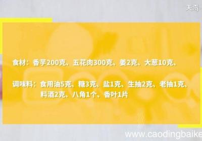 步骤1食材:香芋200克、五花肉300克、姜2克、大葱10克 。调味料:食用油5克、糖3克、盐1克、生抽2克、老抽1克、料酒2克、八角1个、香叶1片 。步骤2【五花肉的做法 五花肉怎么做】香芋切滚刀块 。步骤3姜切片 。步骤4葱切段 。步骤...