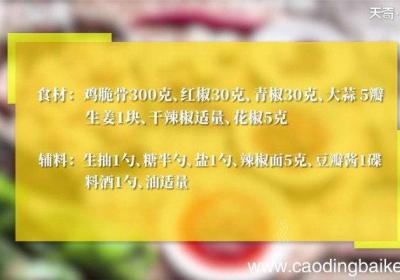 步骤1所需食材:鸡脆骨250克,红椒1个,青椒1个,大蒜6瓣,生姜1块,香菜2根,干辣椒10个,花椒10粒、盐2茶匙,鸡精1茶匙,辣椒面5克,油30克,料酒1汤匙,生抽1汤匙,豆瓣酱1碟 。步骤2鸡脆骨清洗干净,放生抽、盐、辣椒粉、料酒,一...