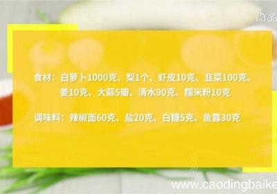 步骤1食材:白萝卜1000克、梨1个、虾皮10克、韭菜100克、姜10克、大蒜5瓣、清水90克、糯米粉10克、辣椒面60克、盐20克、白糖5克、鱼露30克 。步骤2白萝卜去皮 。步骤3切小方块 。步骤4加入盐拌匀腌制20分钟 。步骤5倒掉腌...
