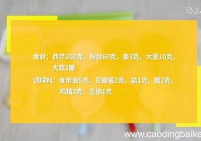 发布时间: 7小时前步骤1食材:西芹200克、粉丝60克、姜3克、大葱10克、大蒜2瓣 。调味料:食用油5克、豆瓣酱2克、盐1克、醋2克、鸡精2克、生抽1克 。步骤2西芹切斜段 。步骤3粉丝用温水泡软 。步骤4姜切片 。步骤5大葱切斜片 。步骤6大蒜切末 。步...
