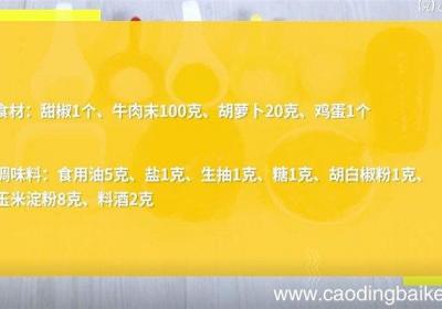 步骤1准备食材:甜椒1个、牛肉末100克、胡萝卜20克、鸡蛋1个、食用油5克、盐1克、生抽1克、糖1克、胡白椒粉1克、玉米淀粉8克、料酒2克步骤2甜椒切圈步骤3胡萝卜切末步骤4取大碗,放入牛肉末、胡萝卜,加入盐、生抽、糖、玉米淀粉、料酒,打...