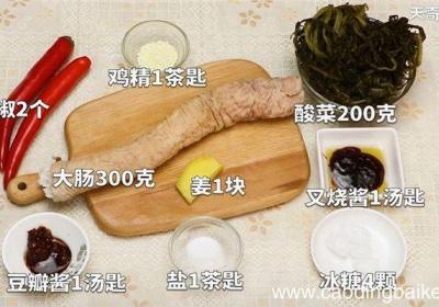 步骤1准备食材:大肠300克,酸菜200克,红椒2个,冰糖4颗,姜1块,叉烧酱1汤匙,鸡精1茶匙,盐1茶匙,豆瓣酱1汤匙 。步骤2姜切丝,红椒切段,酸菜切小段 。步骤3锅中倒入清水,放入大肠,冰糖,姜丝,小伙加盖煮40分钟 。步骤4酸菜用清...