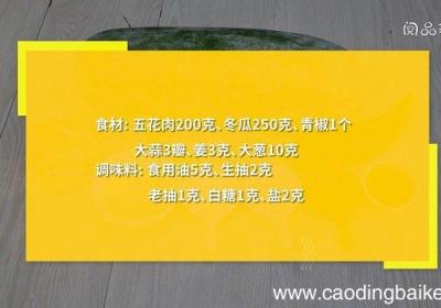 步骤1食材:五花肉200克、冬瓜250克、青椒1个、大蒜3瓣、姜3克、大葱10克 。调味料:食用油5克、生抽2克、老抽1克、白糖1克、盐2克 。步骤2五花肉切片 。步骤3冬瓜切片 。步骤4青椒切块 。步骤5大蒜切粒 。步骤6姜切丝 。步骤7...