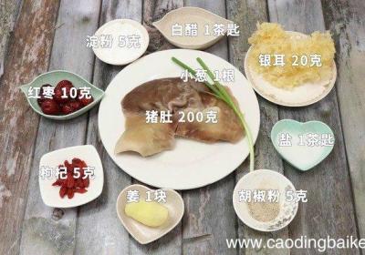 步骤1准备食材:猪肚200克、银耳20克、姜1块、小葱1根、淀粉5克、盐1茶匙、白醋1茶匙、枸杞5克、红枣10克、胡椒粉5克 。步骤2姜洗净切片 。步骤3小葱切葱花 。步骤4红枣去核对半切 。步骤5银耳泡发撕小朵 。步骤6首先碗中倒入猪肚、...