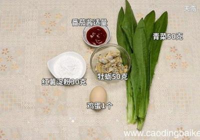 步骤1准备食材:牡蛎50克、番茄酱适量、青菜50克、鸡蛋1个、红薯淀粉30克 。步骤2红薯淀粉加入60克水搅匀备用 。步骤3青菜洗干净后切成粗丝 。步骤4平底锅中倒入适量油,加热后晃匀锅底 。步骤5倒入红薯粉水,晃动锅使其均匀的铺在锅里 。...