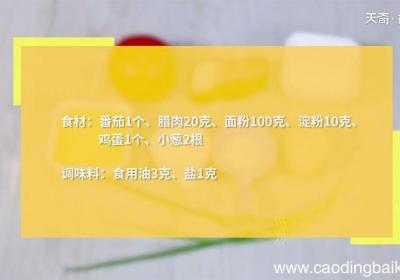 步骤1食材:番茄1个、腊肉20克、面粉100克、淀粉10克、鸡蛋1个、小葱2根 。调味料:食用油3克、盐1克 。步骤2番茄去皮、切小碎粒、腊肉切小碎粒、小葱切葱花 。步骤3碗中放入面粉、淀粉、混合、打入鸡蛋、放入盐、倒少量清水、调成稀糊状...