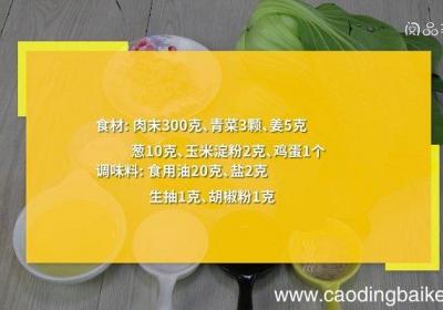 步骤1食材:肉末300克、青菜3颗、姜5克、大葱10克、玉米淀粉2克、鸡蛋1个 。调味料:食用油20克、盐2克、生抽1克、胡椒粉1克 。步骤2姜切末 。步骤3大葱切末 。步骤4大碗中放入肉末、姜末、葱末、玉米淀粉、鸡蛋、1克盐、1克生抽,拌...