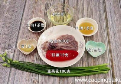 步骤1准备食材:韭菜花100克、鱿鱼200克、姜1块、料酒1茶匙、生抽1茶匙、盐1茶匙、油适量、红椒15克 。步骤2鱿鱼洗净切段备用 。步骤3姜切片 。步骤4韭菜花洗净切段 。步骤5红椒切丝 。步骤6起锅倒油,油热加入姜片爆香 。步骤7再加...