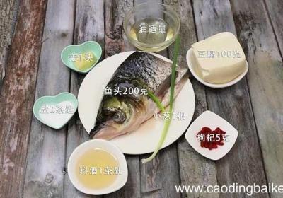 步骤1准备食材:鱼头200克、豆腐100克、油适量、姜1块、盐2茶匙、枸杞5克、料酒1茶匙、小葱1根【清炖鱼头豆腐汤怎么做 清炖鱼头豆腐汤的做法】步骤2鱼头洗净打上花刀 。步骤3豆腐切块 。步骤4姜切片 。步骤5小葱切葱花 。步骤6首先碗中...