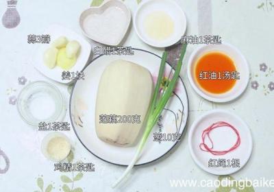 步骤1准备食材:莲藕200克,葱10克,蒜3瓣,姜1块,红油1茶匙,麻油1汤匙,盐1茶匙,鸡精1茶匙,白醋1茶匙,红绳一根 。步骤2姜切末 。步骤3蒜切末 。步骤4葱切葱花 。步骤5莲藕切片 。步骤6碗中放入姜、蒜、白醋、盐、鸡精、红油和麻...