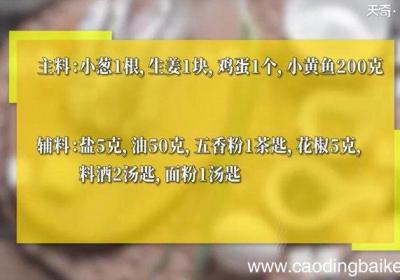 步骤1所需食材:小葱1根,生姜1块,鸡蛋1个,小黄鱼200克 。所需调料:盐5克,油50克,五香粉1茶匙,花椒5克,料酒2汤匙,面粉1汤匙 。步骤2小鱼去腮 。步骤3小葱切段 。步骤4姜切片 。步骤5小鱼加葱段、姜片、花椒、料酒腌制1小时,...