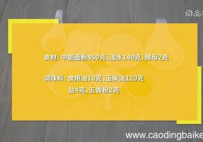 步骤1食材:中筋面粉450克、温水140克、酵母2克 。调味料:食用油10克、玉米油120克、盐4克、五香粉2克 。步骤2盆中放入200克面粉、100克玉米油、2克盐、2克五香粉,揉匀成油酥面团,松弛20分钟 。步骤3均分成10份,搓成圆形...