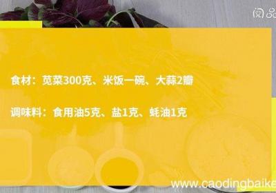 步骤1食材:苋菜300克、米饭一碗、大蒜2瓣 。调味料:食用油5克、盐1克、蚝油1克 。步骤2苋菜洗净,沥干水分,切小段 。步骤3大蒜切末 。步骤4热锅倒油,油温5成热时 ,下入蒜末,爆香 。倒入苋菜,翻炒至变软 。步骤5【苋菜炒饭的做法...
