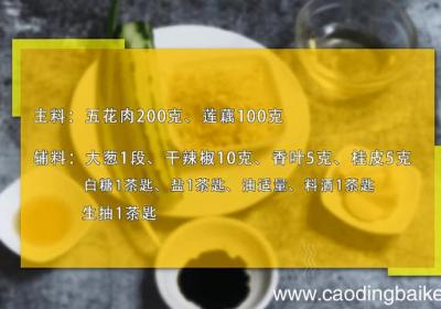 步骤1准备食材:五花肉200克、莲藕100克、大葱1段、干辣椒10克、香叶5克、桂皮5克、白糖1茶匙、盐1茶匙、油适量、料酒1茶匙、生抽1茶匙 。步骤2五花肉洗净切块 。步骤3莲藕去皮切块 。步骤4大葱切段 。步骤5干辣椒切段 。步骤6锅中...