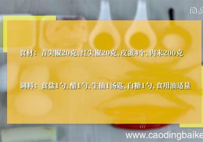 步骤1准备食材:青尖椒20克、红尖椒20克、皮蛋4个、肉末200克、食盐1勺、醋1勺、生抽1汤匙、白糖1勺、食用油适量 。步骤2锅中烧水,将皮蛋连壳放入锅中 。步骤3皮蛋煮5分钟后捞出 。步骤4将冷却后的皮蛋去壳 。步骤5皮蛋用冷水浸泡一下...