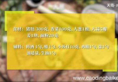 步骤1食材:猪肚300克、香菜100克、大葱1根、大蒜5瓣、姜1块、面粉20克 。辅料:料酒1勺、醋1勺、小苏打10克、鸡精1勺、盐1勺、油适量、生抽1勺 。步骤2猪肚加入小苏打,面粉、醋、大葱叶,揉搓 。加入清水,揉搓清洗,直至无污水 。...