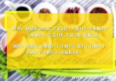 步骤1熟猪肚300克、芹菜1段、大葱1段、小米椒3个、干辣椒6个、生姜1块、大蒜2瓣、花椒3克、 油适量、豆瓣酱1勺、生抽1勺、盐1勺、白糖1勺、料酒1勺、鸡精1勺 、胡椒粉1克 。步骤2芹菜切成小条 。步骤3【爆炒肚丝的做法 爆炒肚丝怎么...