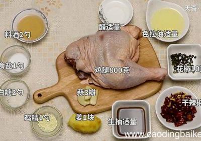 步骤1准备食材:鸡腿800克、姜1块、蒜3瓣、干辣椒10克、花椒10克、食盐1勺、醋适量、鸡精1勺、料酒2勺、生抽适量、白糖2勺、色拉油适量 。步骤2首先把姜切片 。步骤3蒜切片备用。步骤4鸡腿剁小块 。步骤5加盐、生抽、姜、花椒、醋、料酒...