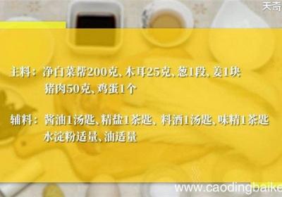 步骤1准备食材:净白菜帮200克,水发木耳25克,葱1段,姜1块,猪肉50克,鸡蛋1个,油适量,酱油1茶匙,精盐1茶匙,料酒1汤匙,味精1茶匙,水淀粉适量 。步骤2姜切末,葱切末,猪肉切成丝,白菜斜切成片,再顺切成丝 。步骤3木耳撕成小朵,...