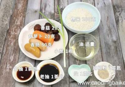 步骤1准备材料:糯米200克 、香肠50克、香菇20克,胡萝卜20克,小葱1根、生抽1茶匙、老抽1茶匙、盐1茶匙、胡椒粉1茶匙、油适量 。步骤2糯米洗净浸泡30分钟 。步骤3香肠切丁 。步骤4香菇洗净切丁 。步骤5胡萝卜切丁 。步骤6小葱切...
