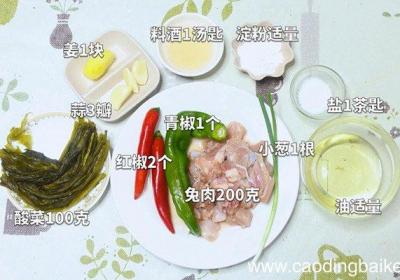 步骤1准备食材:兔肉200克、酸菜100克、青椒1个、红椒2个、姜1块、蒜3瓣、小葱1根、料酒1汤匙、淀粉适量、盐1茶匙、油适量 。步骤2酸菜切丁 。步骤3姜切末 。步骤4蒜切末 。步骤5葱切段 。步骤6青椒切小段 。步骤7红椒切圈 。步骤...
