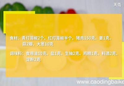 步骤1食材:青灯笼椒2个、红灯笼椒半个、猪肉150克、姜1克、蒜2瓣、大葱10克 。调味料:食用油10克、盐1克、生抽2克、鸡精1克、料酒2克、淀粉2克 。步骤2青灯笼椒切丝 。步骤3红灯笼椒切丝 。步骤4姜切末 。步骤5蒜切片 。步骤6大...