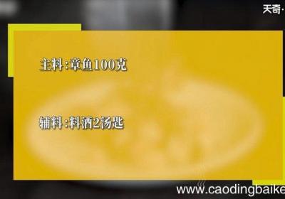 步骤1所需食材:章鱼100克 。所需调料:料酒2汤匙 。步骤2八爪鱼撕去外皮,去内脏眼睛 。步骤3加清水洗干净,沥干水分放入盘中,加入料酒腌制10分钟 。步骤4锅中沸水,放入八爪鱼焯水,加入一勺料酒,煮熟捞出即可 。【八爪鱼焯水的做法 八爪...