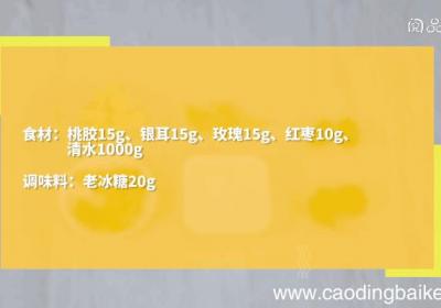 步骤1准备食材:桃胶15g、银耳15g、玫瑰15g、红枣10g、清水1000g、老冰糖20g 。步骤2桃胶用清水提前浸泡12小时 。步骤3银耳泡2小时 。步骤4将桃胶和银耳去掉杂质洗净备用,玫瑰、红枣洗净备用 。步骤5锅中加入清水,将玫瑰、...