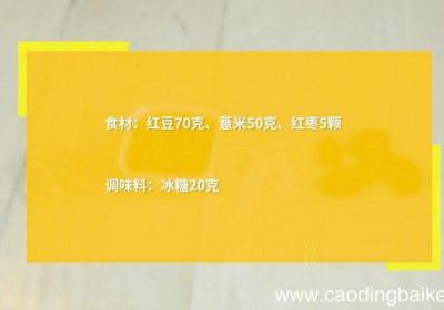 步骤1食材:红豆70克、薏米50克、红枣5颗、冰糖20克 。步骤2将红豆、薏米洗净,用清水浸泡3小时 。步骤3锅中放入适量清水,放入红豆、薏米煮沸,小火慢煮90分钟,放入红枣、冰糖,继续煮至冰糖融化即可 。【薏米红豆红枣的做法 薏米红豆红枣...