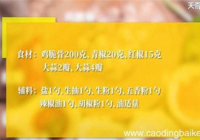 步骤1所需食材:鸡脆骨200克,青椒20克,红椒15克,大蒜2瓣 。所需调料:盐1勺,生抽1勺,生粉1勺,五香粉1勺,辣椒油1勺、胡椒粉1勺、油适量 。步骤2红椒切末 。步骤3青椒切末 。【椒盐鸡脆骨怎么做 椒盐鸡脆骨的做法】步骤4蒜切末...