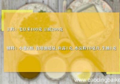 步骤1主料:毛豆米100克,豆腐200克 。辅料:小葱2根、食用油适量、鱼露1克、水淀粉10毫升、生抽1克 。步骤2豆腐切成小丁 。步骤3小葱切成葱花 。步骤4锅中热油,油温5成热爆香葱花 。步骤5下入毛豆米翻炒2分钟 。步骤6倒入豆腐炒匀...